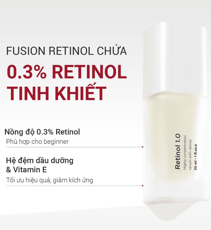 Điểm khác biệt của Fusion Retinol nằm ở Retinol tinh khiết 0.3% được ổn định bằng hệ đệm dầu dưỡng và Vitamin E. Nhờ đó, retinol phát huy hiệu quả đều đặn trên da nhưng vẫn êm dịu hơn, hạn chế cảm giác bong tróc hay kích ứng thường gặp. Công thức này giúp da dễ làm quen, dễ duy trì và dễ kết hợp trong các routine điều trị mụn - thâm - sắc tố - lão hóa.