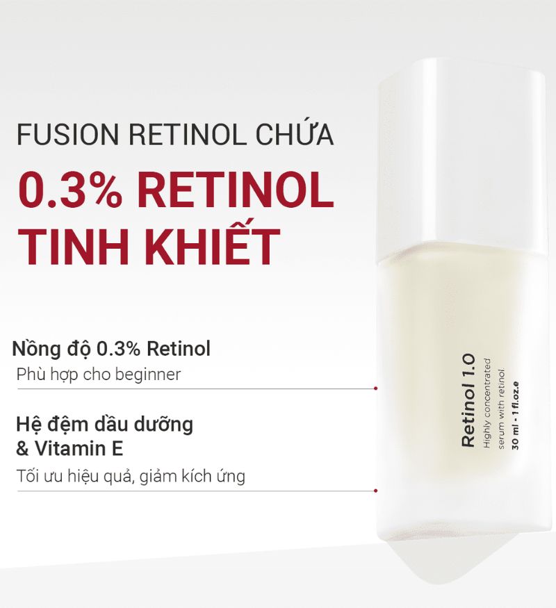 Fusion Retinol 0.3% (phiên bản nâng cấp) là tinh chất retinol chuyên biệt đến từ Fusion Meso – Tây Ban Nha, được thiết kế để cải thiện nhiều vấn đề da cùng lúc: mụn, thâm, bề mặt da sần, lỗ chân lông to và các dấu hiệu lão hóa sớm. Sản phẩm phù hợp cho người mới bắt đầu retinol hoặc những ai muốn duy trì làn da khỏe đẹp lâu dài.