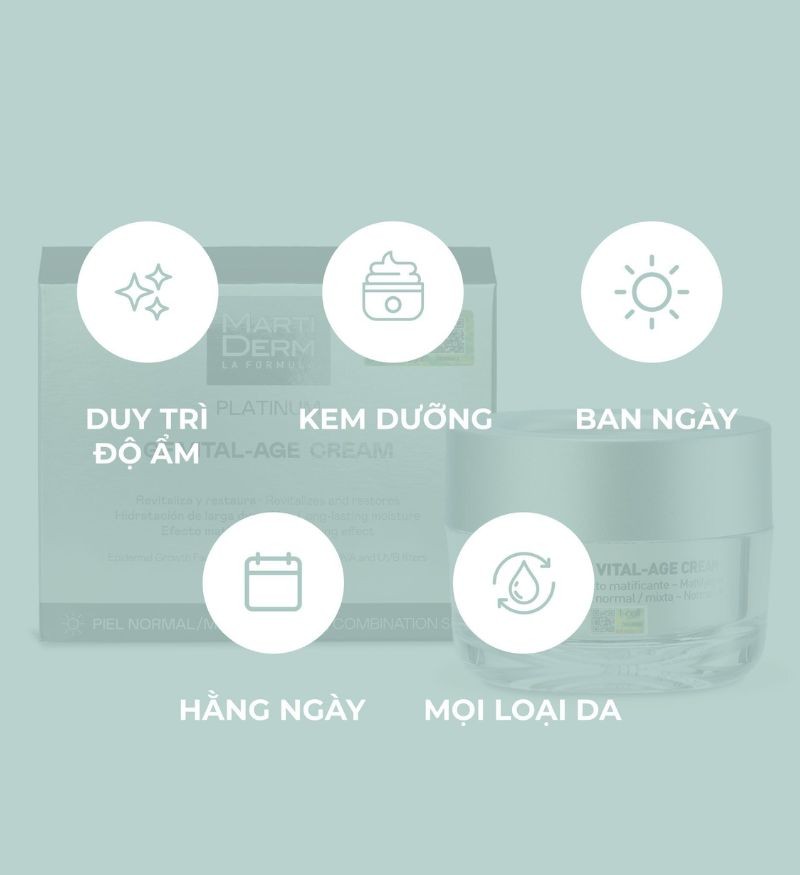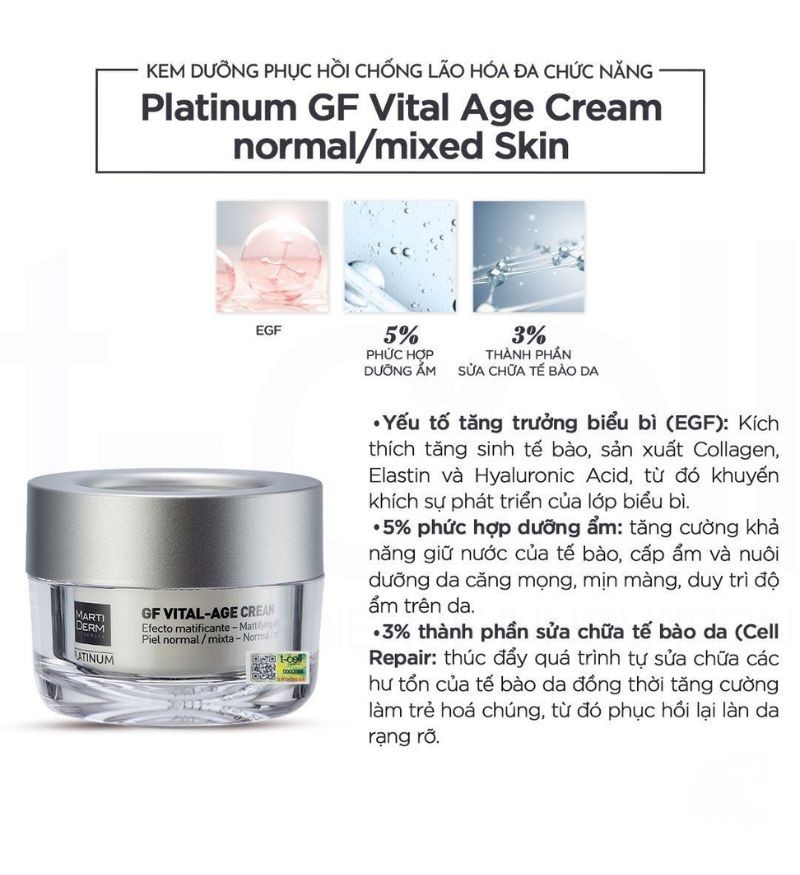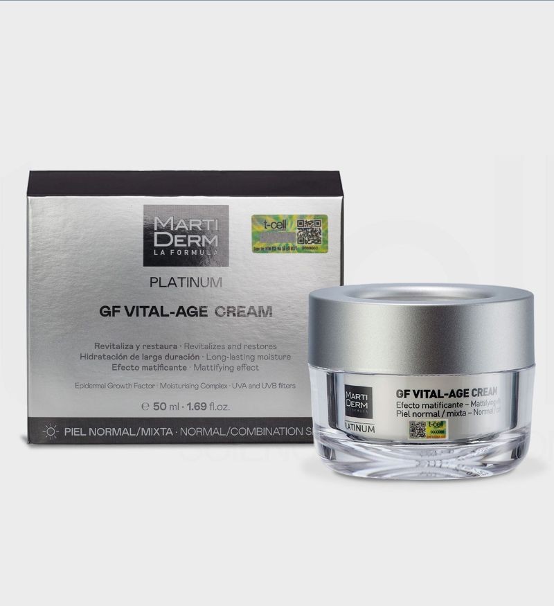 MartiDerm Platinum GF Vital Age Cream normal/mixed Skin là kem dưỡng phục hồi da đa chức năng, lý tưởng cho da thường và da hỗn hợp, đến từ thương hiệu dược mỹ phẩm MartiDerm - Tây Ban Nha.