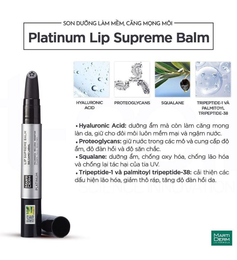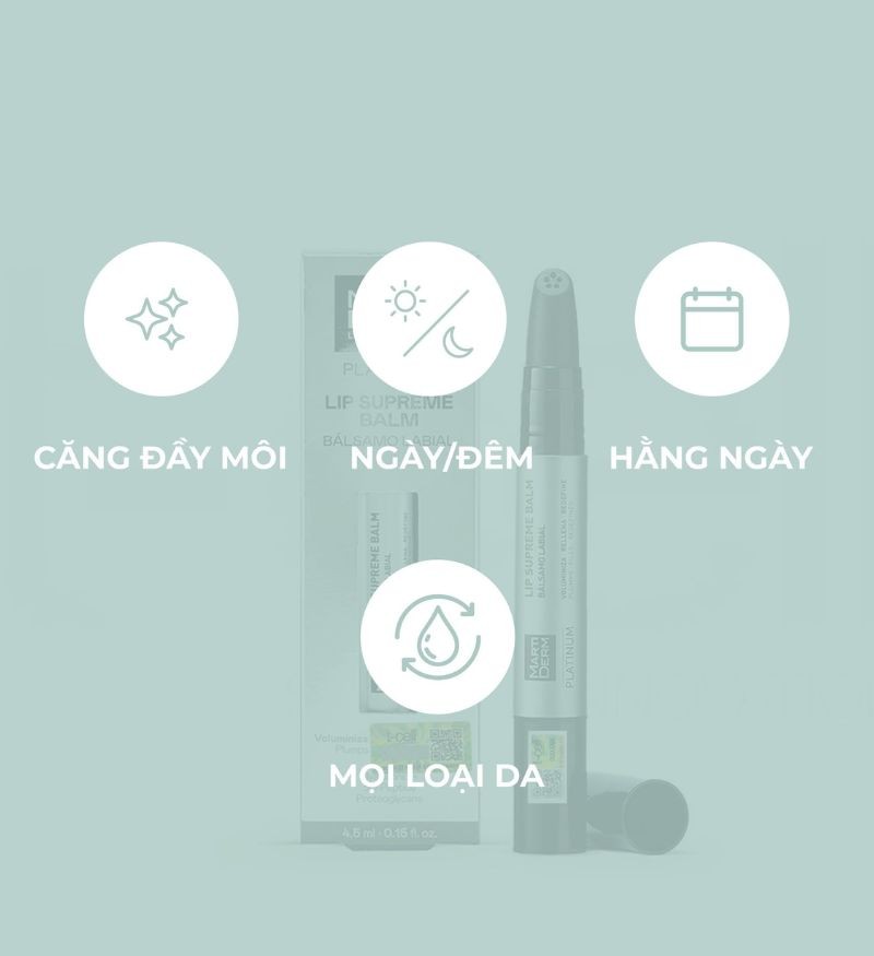 MartiDerm Platinum Lip Supreme Balm là dòng son dưỡng môi cao cấp đến từ thương hiệu dược mỹ phẩm hàng đầu Martiderm - Tây Ban Nha. Sản phẩm vượt xa các loại son dưỡng thông thường nhờ sự kết hợp giữa Proteoglycans và Hyaluronic Acid giúp hydrat hóa đôi môi gấp nhiều lần. Công thức tích hợp hệ Peptide tiên tiến cùng các loại dầu thực vật giàu axit béo giúp tái cấu trúc và làm đầy các rãnh môi hiệu quả.
