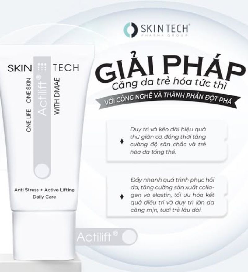 Kem dưỡng SkinTech Actilift có hoạt chất cốt lõi là DMAE (Dimethyl MEA), có khả năng tác động trực tiếp lên các sợi cơ dưới da, kích thích sự co lại của chúng. Cơ chế độc đáo này mang lại hiệu ứng nâng cơ và làm săn chắc da tức thì, giúp cải thiện rõ rệt đường nét khuôn mặt và giảm thiểu sự xuất hiện của các nếp nhăn.